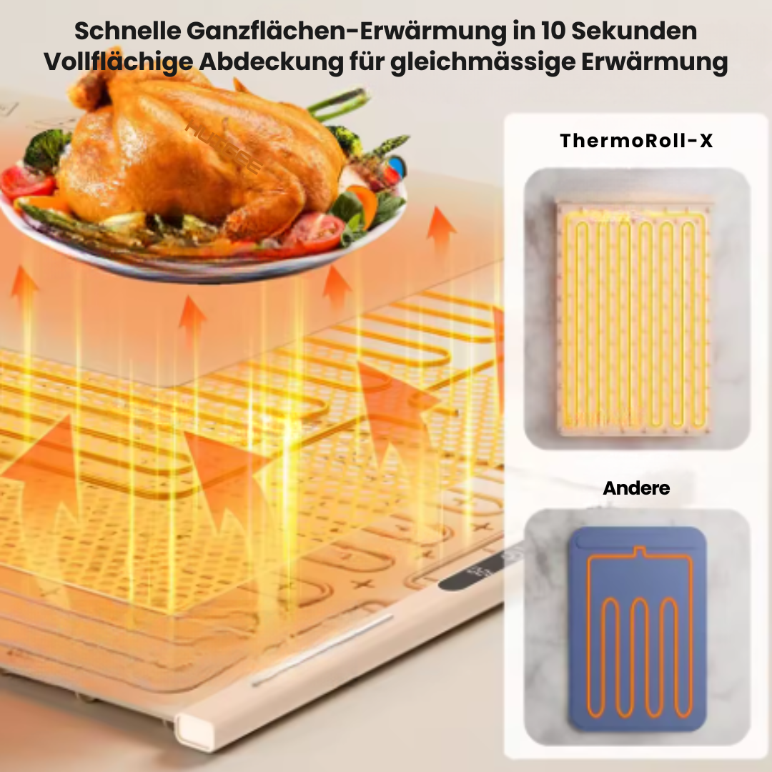 Mit ThermoRoll bleibt dein Lieblingsessen stundenlang warm, ohne Austrocknen oder Anbrennen. Ideal für Zuhause, Büro oder unterwegs – einfach ausrollen, einschalten und geniessen.